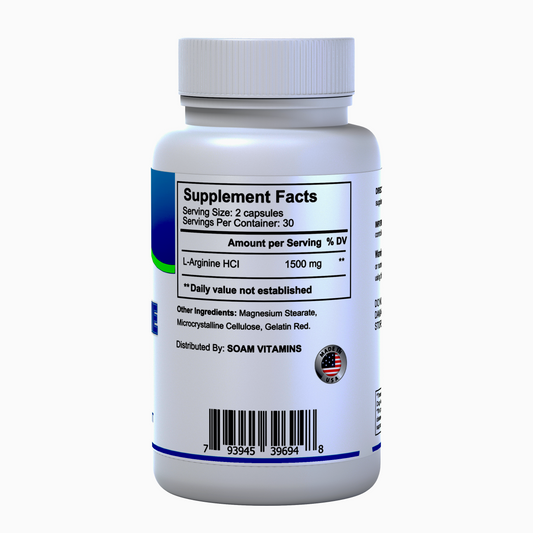 L-Arginine HCl 1500 mg for Male and Female - Arginine - 60 capsules - Amino Acids Supplement - Muscle Support and Blood Flow - Enhanced Performance Supplement - SOAM